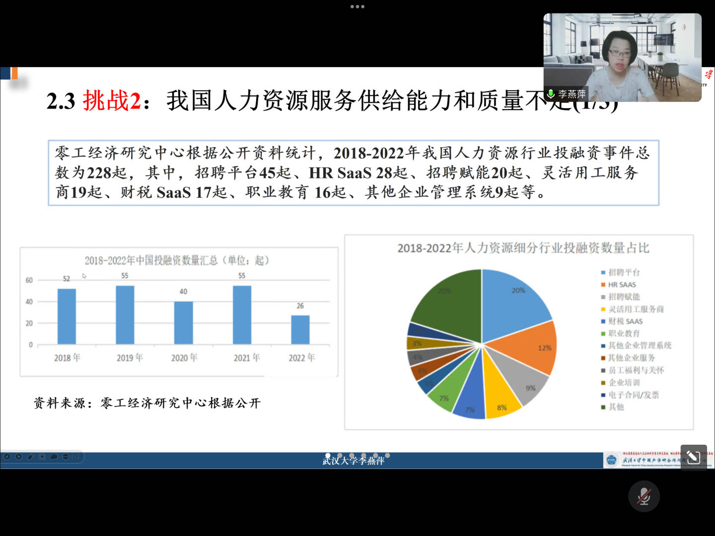 李教授在講座中還具體介紹了我國人力資源服務企業的現狀、機遇和挑戰。她結合人力資源服務機構的數量、總營業收入、從業人員、服務用人單位次數、國家產業園建成數量等數據指出,我國的人力資源服務企業規模和業務持續增長并呈集聚化、集團化、品牌化的發展趨勢。同時,李教授還從政府的重視、新時代發展的需要以及數字經濟的發展三個角度具體闡述了我國人力資源服務企業發展所面臨的機遇。在談到我國人力資源服務企業所面臨的挑戰時,李教授站在國際視角上,結合國內外的行業環境以及具體的調查數據和文獻研究認為我國的人力資源服務企業雖然發展迅速,一片藍海,但其國際競爭力依然不夠,與其他國家相比仍然存在一定的差距。李教授還認為我國人力資源服務存在供給能力和質量不足的情況,并結合零工經濟研究中心公開的投融資事件的相關數據進行了具體的分析。
