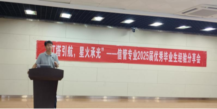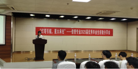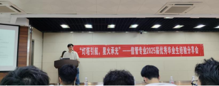 為助力學子錨定人生航向,5月23日晚,學院信息管理與信息系統專業于16棟教學樓2樓報告廳舉辦主題為“燈塔引航,星火承光”的2025屆優秀畢業生經驗分享會。活動特邀本專業10名保研、考研、考公、就業、留學等領域優秀畢業生和1位優秀校友擔任主講。學院近200名學生到場聆聽,信息管理與信息系統系主任楊單、杜文華等出席活動。