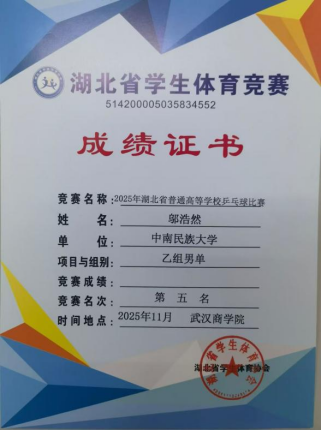 11月1日至4日,2025年湖北省普通高等學校乒乓球比賽在武漢商學院舉行。我院2023級管理科學與工程專業碩士研究生鄔浩然經過四天激烈角逐,最終取得乙組(普通生組)男子單打第五名的優異成績。