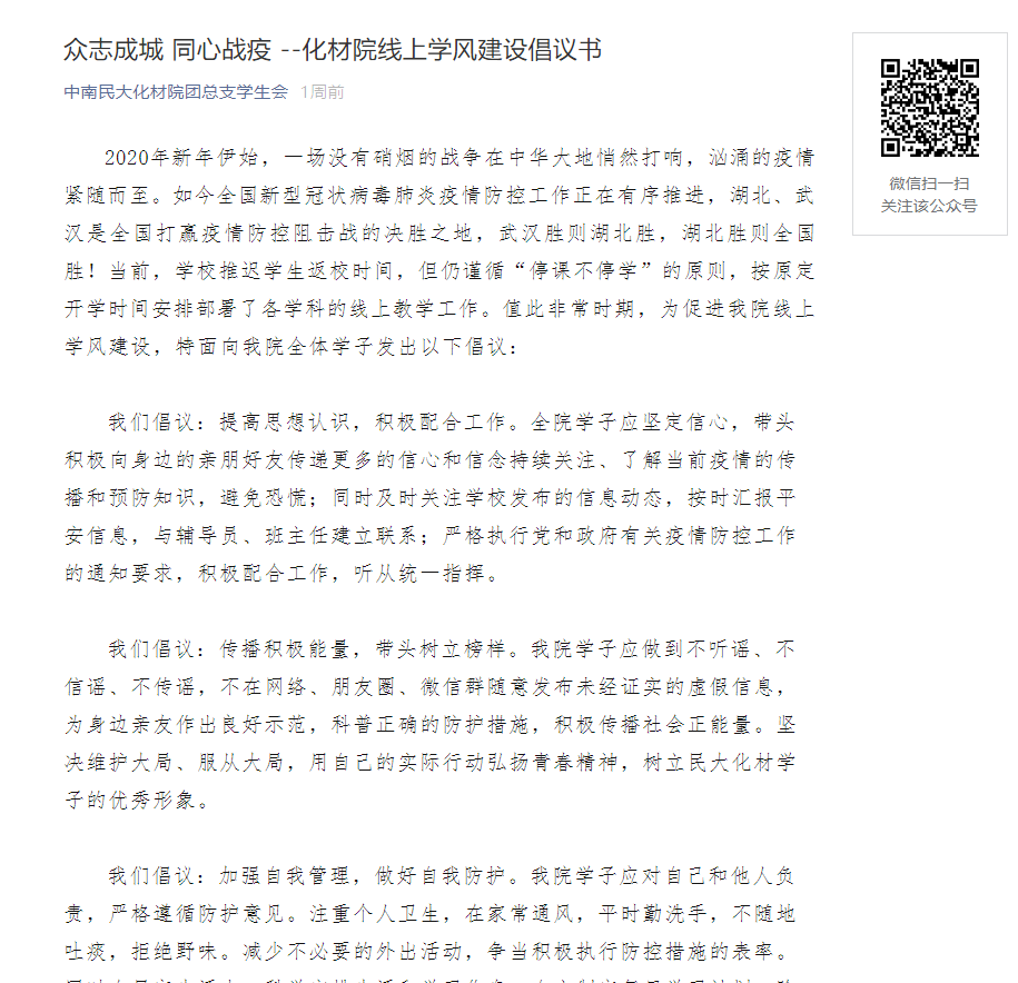 化學與材料科學學院在線學風倡議書部分內容。 結合專業學習要求,音樂舞蹈學院打破學院一貫“手機不進課堂”的做法,以“舞”抗“疫”。學生們在家錄制練功、練聲的視頻,通過打卡、直播等形式,彼此監督,保證疫情防控期間學習進度和學習質量。 美術學院“以賽促學”,組織開展了“武漢·吾捍:藝術的力量”征稿活動,廣泛征集抗擊疫情主題創作作品。同時,結合課程教學安排,引導學生努力創作更多振奮精神、鼓舞士氣的優秀作品,弘揚主旋律,傳播正能量,助力早日打贏疫情防控阻擊戰。