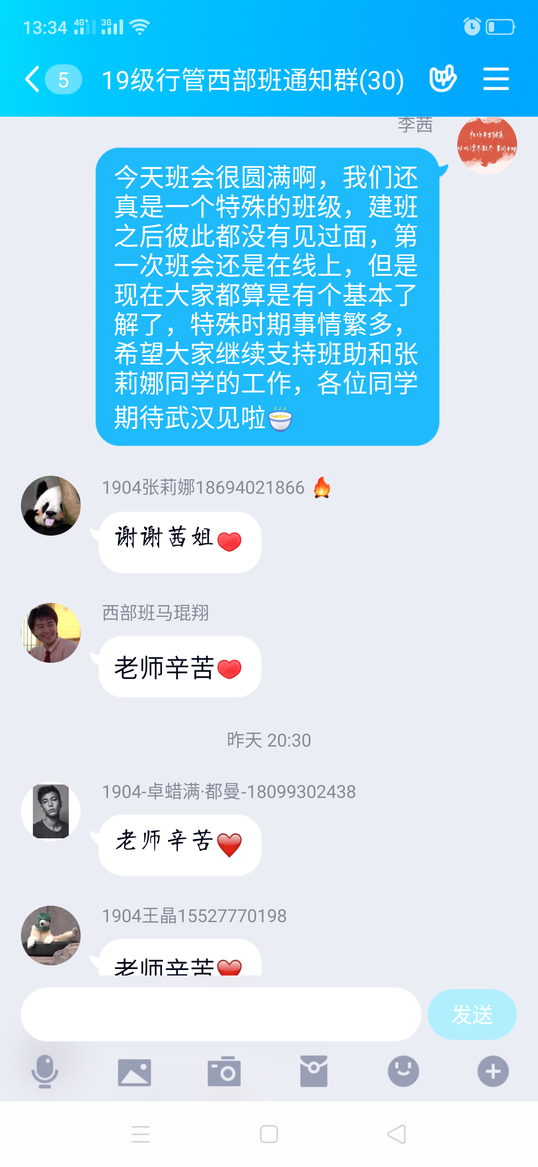 2019級西部實驗班線上班會部分內容。 為了加深認識,來自五湖四海的同學們,用家鄉話介紹民族特色,以家鄉身邊的逆行者為話題,表達了對醫護軍人的贊美,對志愿者的贊許,對國家的贊頌。最后,同學們飽含熱淚在群里發表自己想對武漢說的話及自己制作的畫報,為武漢加油!為中國加油!李茜老師說:“雖然我們是來自不同地區的不同民族,但我們有一個共同的名字叫中華民族。我們這個民族面對困境從來不會退縮。那些逆行者就是民族的脊梁,我們要以他們為榜樣,努力成為國家的棟梁,民族的希望。” 這場班會,時間特殊,人員特殊,方式特殊,但是對祖國的愛和對武漢的情感依然如故。班上同學雖然沒有見過面,但是通過班會將心連在了一起。同心戰“疫”,守望相助,期待春暖花開,武漢相聚。 據了解,在開學的第一周,全校21個學院,已有370個班級、萬余名學生參與了在線主題班會。班會前,同學們積極準備分享;班會過程中,同學們及時關注,積極參與;班會后,同學們樹立了積極抗疫、不懼困難的精神。輔導員老師更是通過話題討論、主題征文、音視頻錄制、居家健身直播等形式,以學習通、智慧樹、騰訊會議等平臺為工具,引導青年學生在危難時刻更要發揚愛國熱情,始終與祖國同命運,與人民共患難,堅定做“守護者”“修行者”“識途者”的信念。 經濟學院1911-1916班在輔導員高無盡老師的組織下,以“經‘疫’事、長一智”為主題,以班級為單位各自開展了主題班會。 1915班班主任李彥軍老師一同參與了以“武漢加油,共渡難關”為題的線上班會。李彥軍老師不但強調疫情防控重要性,也對同學們的網課學習提出建議,并希望同學們能夠居家鍛煉、強身健體;同學們通過視頻、PPT、學習欄目分享等形式,分享了對于疫情的感觸,討論了關于網課學習的意見和注意點,為在家學習的同學們提供了多種學習方法。身在武漢的陳丹妮同學通過圖片展示身邊涌現出來的先進典型、英雄人物和感人事跡,讓大家近距離感受武漢人民眾志成城。 通過主題班會,同學們線上聯絡感情彼此分享各自感觸的同時,大家對各地共渡難關更增添了信心,希望武漢早日渡過疫情難關,我們早日線下重逢武漢!