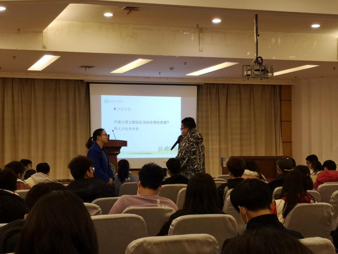11月26日晚,由大學(xué)生心理健康教育中心組織的2020級(jí)心理委員“如何開(kāi)展心理主題班會(huì)”工作技能主題培訓(xùn)在潤(rùn)良報(bào)告廳舉行。武漢科技大學(xué)心理健康教育教研室主任薛春燕教授擔(dān)任主講,心理健康教育中心丁太一老師擔(dān)任主持人,我校2020級(jí)全體心理委員參加了此次培訓(xùn)。