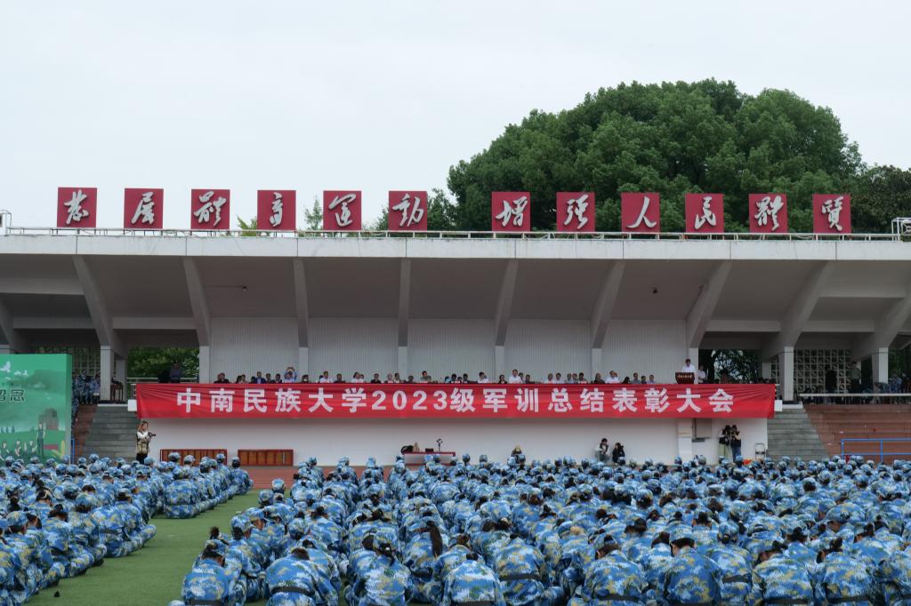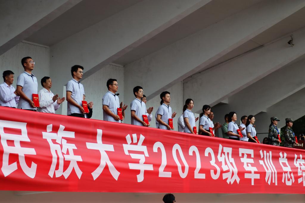 軍訓匯演結束之后,校黨委副書記、副校長白江源宣讀了《中南民族大學2023級本科生軍訓工作先進單位及先進個人表彰決定》。主席臺領導先后為軍訓中獲得16個單位“優秀連隊”、43名“優秀教官”、9名“優秀指導員”、5人“優秀助訓教管”、320名“優秀學員”頒獎。隨后,軍械士官學校副校長程志勇作軍訓工作交流發言,中南民族大學校長李金林向軍訓團贈送軍訓紀念錦旗。