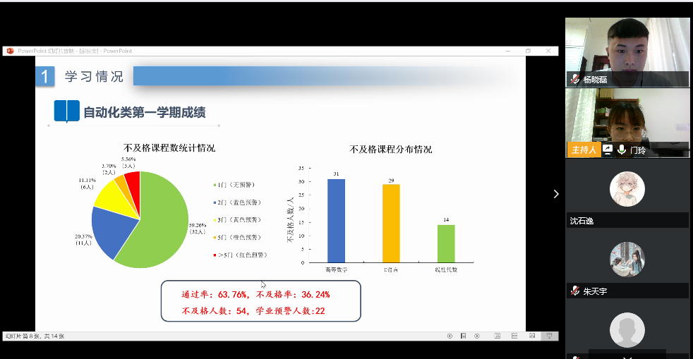 輔導員門玲、楊曉磊介紹并分析了大一學年學生學習情況。門玲老師重點介紹了第一學期學業預警情況以及各專業成績分布情況,并強調由于大一新生仍然處于學習習慣的養成和轉變期,因此家長要配合學院做好學生學習方面的監督管理工作。楊曉磊老師詳細說明了本學期線上學習情況的相關情況。 計算機類1903班的吳镕杰同學和自動化類1902班的杜曉雯同學作為學生代表分享學習經驗和心得。 在互動交流環節中,許多家長都在留言板上表達了對于學校以及學院工作的感謝和肯定,從流量補貼到教材郵寄,再到家長會,在疫情期間時刻能夠感受到學校和老師對于學生的關心和幫助。此外,對于很多家長關心的學生居家管理問題以學業規劃等疑問,兩位輔導員老師一一解答。