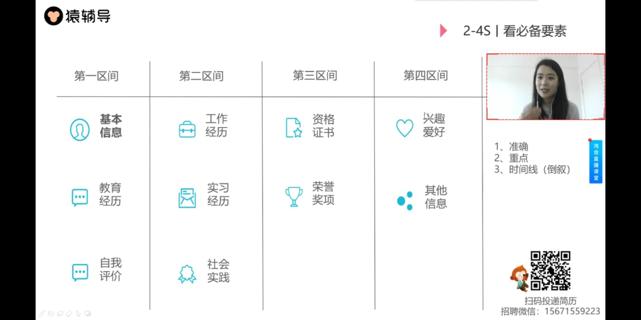 劉昕同學進行講解。 培訓課從簡歷制作目的、簡歷制作要素、面試官幾點建議、猿輔導招聘崗位四方面進行。劉昕提到面試官平均十秒看一份簡歷,面試官主要看整體視覺、必備要素、工作經歷、亮點信息和其他信息,針對這五要素,一一進行了講解。簡歷應做到模板清晰,風格統一,必備要素主要包括基本信息、教育經歷、實踐經歷等,工作經歷應采用倒敘的方式,同時應加入具體數據,使HR眼前一亮,針對沒有很多工作實習經歷的同學來說,可通過課程設計、獎學金、發表的作品、參與崗位相關的培訓經歷等內容來豐富自己的簡歷,劉昕還通過正反案例來進行指導,加深了同學們的印象。還站在面試官的角度給出了幾點建議:簡歷精簡不等于簡短,篇幅應控制在一頁以內,針對不同崗位必須有所側重和調整,不能一份簡歷海投所有崗位,簡歷要經得起面試官的推敲,一定不要造假。 最后,劉昕對猿輔導以及正在招聘的崗位進行了宣講,歡迎2020屆畢業生加入猿輔導,同時也預祝同學們在春招中找到心儀的工作!通過此次培訓課,同學們對簡歷制作有了新的認識,相信經過簡歷指導課后,同學們定會收到心儀公司的面試,并在此次春招中順利找到工作。 據悉,自疫情發生以來,管理學院多舉措推動畢業生就業工作,目前已在線上舉辦了多場線上招聘會,發布招聘信息200余條,進行了多次一對一求職簡歷指導。 (來源:管理學院 編輯:朱芷軒)