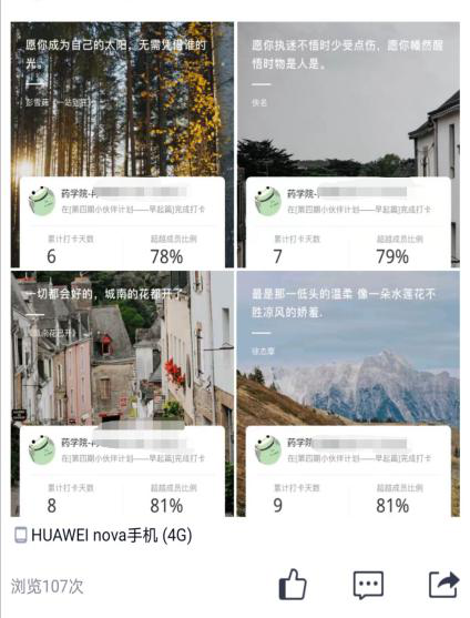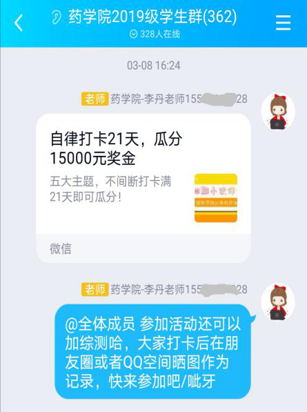 李丹老師開展工作和學(xué)生積極參與打卡活動的記錄。 召開“云班會”,增強自主學(xué)習(xí)意識 在輔導(dǎo)員、班主任、班助的帶領(lǐng)下,藥學(xué)院2019級各班召開新學(xué)期線上會議。會上共同學(xué)習(xí)疫情期間線上教學(xué)的相關(guān)說明,討論如何更好地進行線上學(xué)習(xí),提出線上學(xué)習(xí)應(yīng)提高自身重視,做好新學(xué)期規(guī)劃,鼓勵同學(xué)們利用好網(wǎng)絡(luò)資源和現(xiàn)有條件,希望同學(xué)們線上學(xué)習(xí)與線下學(xué)習(xí)一樣,及時完成任課教師布置的各項學(xué)習(xí)內(nèi)容。 開展“云預(yù)警”,剖析原因精準施策 年級輔導(dǎo)員李丹老師整理學(xué)生上學(xué)期學(xué)業(yè)情況,摸排學(xué)習(xí)掛科學(xué)生,通過QQ、微信等渠道逐一聯(lián)系,幫助學(xué)生分析學(xué)業(yè)掛科原因,端正學(xué)習(xí)態(tài)度,改進學(xué)習(xí)方法,督促學(xué)生制定學(xué)習(xí)計劃,確保從源頭上幫助學(xué)生解決學(xué)業(yè)問題。 家校“云聯(lián)系”,形成合力協(xié)同育人 輔導(dǎo)員李丹老師與家長通過建立一對一微信關(guān)系、微信群、QQ群等方式,搭建家校平臺。通過反饋學(xué)生成績、日常表現(xiàn)等情況,讓家長及時、準確地了解學(xué)生情況。告知家長學(xué)校及學(xué)院在疫情期間的相關(guān)管理規(guī)定和對學(xué)生網(wǎng)課學(xué)習(xí)的相關(guān)幫扶措施,希望家長提高重視,參與對學(xué)生的學(xué)習(xí)管理工作,做好學(xué)生線上學(xué)習(xí)的督促和關(guān)注,配合學(xué)校引導(dǎo)學(xué)生努力學(xué)習(xí),積極協(xié)助學(xué)院,以達到學(xué)院與家庭相互監(jiān)管的目的。 組織“云打卡”,相互監(jiān)督共同進步 李丹老師組織2019級學(xué)生參加校學(xué)業(yè)發(fā)展中心“小伙伴計劃”活動,并鼓勵同學(xué)們將打卡曬到QQ空間或朋友圈里,從而起到相互監(jiān)督。互相激勵的作用。同學(xué)們紛紛在早起篇、外語篇、文體篇、日記篇、閱讀篇中打卡,在活動中提升線上學(xué)習(xí)的自覺性、積極性,培養(yǎng)良好的學(xué)習(xí)習(xí)慣。 (來源:藥學(xué)院 編輯:梁瀟瀟) invisible invisible invisible