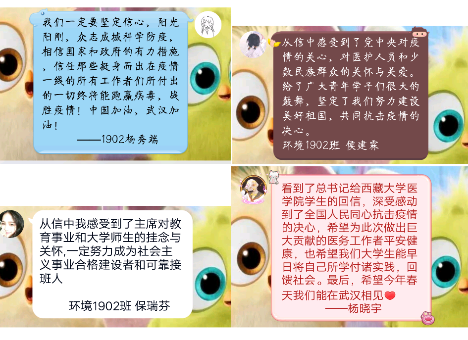 同學們交流學習心得并為武漢加油。 本次班團會緊扣主題,形式多樣,既有線上集體學習、自由發言交流,又有以宿舍為單位進行小組討論分享體會、拍攝武漢加油小視頻等。在主題班團會上,同學們紛紛表示向那些投身于疫情一線的醫務工作者致以崇高的敬意,雖然無法像醫務工作者一樣救死扶傷,但會以醫務工作者為榜樣,時刻牢記習近平總書記對廣大青年學生的殷切期待,努力學習專業知識,練就過硬本領,錘煉品德修為,積極投身祖國的生態文明建設,用實際行動肩負起新時代青年的使命和擔當。正如1902班的候建霖同學在班團會上的發言:“從習近平總書記的回信中可以感受到黨中央對疫情的關心,對醫護人員的關懷和關愛,這給了廣大青年很大的鼓舞,堅定了我們共同抗擊疫情、建設美麗祖國的決心。” 通過本次線上主題班團會,資環學子認真學習并領會了習近平總書記的重要回信精神,讓同學們更加堅定了戰勝疫情、守護家園的信心,更加堅定了作為當代青年大學生應練就過硬本領、畢業后到祖國和人民最需要的地方去奉獻青春、實現人生價值和夢想的決心。 此外,本次主題班團會上學院對在疫情期間參加抗疫志愿服務的我院同學事跡進行了宣傳,同時搜集了解同學們遇到的困難情況,并再次強調了返校紀律要求。 (來源:資源與環境學院 編輯:梁瀟瀟)