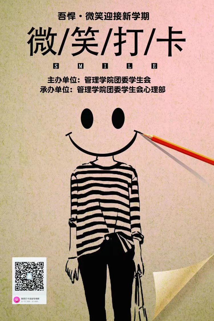 在特殊時期,全國上下齊心協力共同防控疫情,每一個人都在盡自己最大的努力助力防控阻擊戰。2020年3月2日起,由管理學院團委學生會心理部承辦的活動“吾悍·微笑迎接新學期”微笑打卡活動正式拉開帷幕,用微笑的方式號召大家以積極的態度迎接挑戰。
