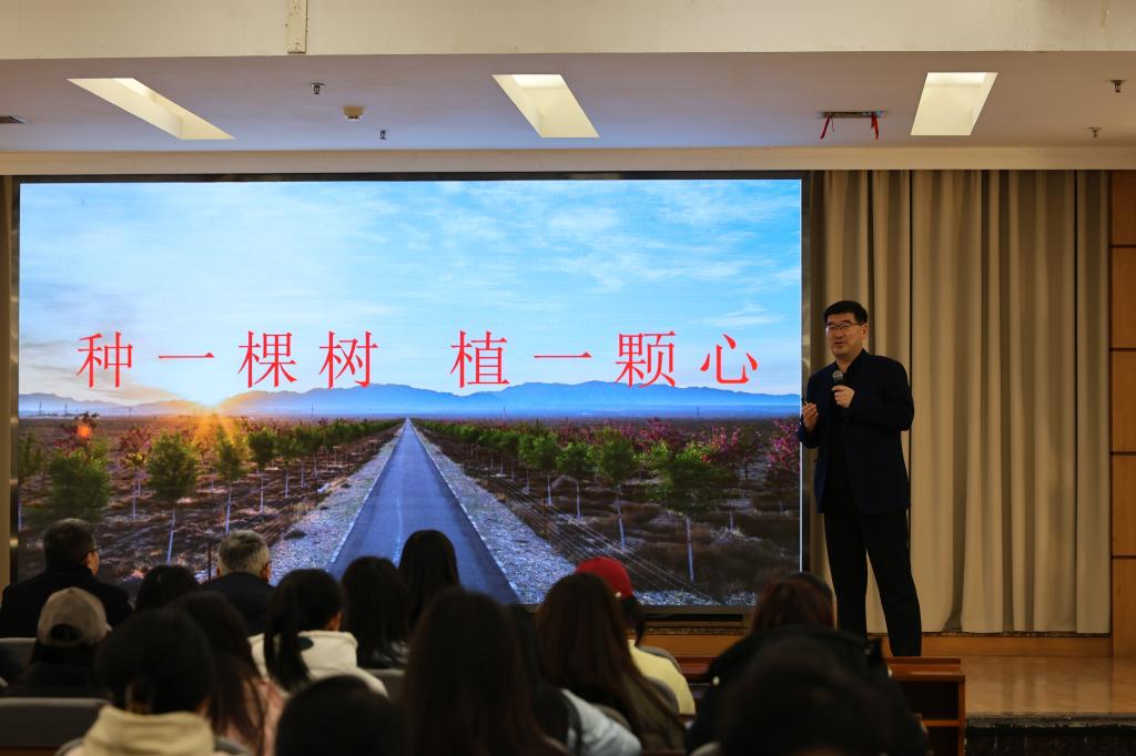 吳老師父子兩代三人在阿拉善沙漠的堅守與奉獻,為我們樹立了光輝的榜樣。他談到,無論是民間、團體還是企業,每個人都可以為生態文明建設貢獻自己的力量,作為學生,我們可以從身邊小事做起,久久為功,共同建立起阿拉善中一道綠色的風景線。