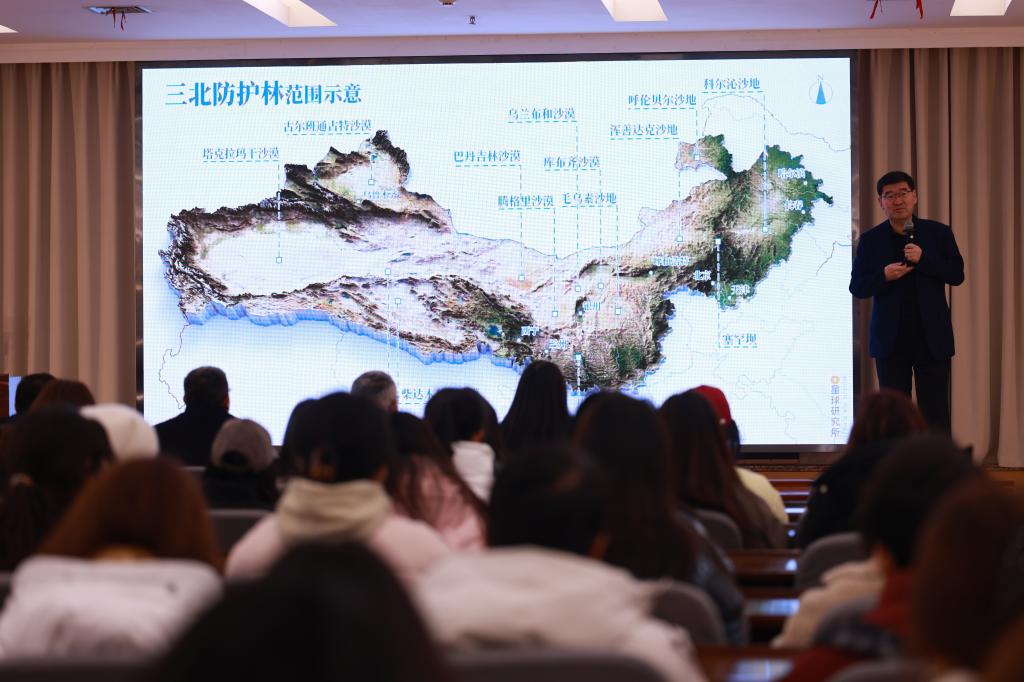 講座中,吳向偉老師通過生動的講述和真實的案例,用“星光林”“科學治沙的探路人——人民楷模王有德”等多個故事向我們講述了“種樹植心”的深刻內涵。他提到,種樹不僅僅是為了改善環境,更是在人們心中種下一顆綠色的種子,讓環保意識生根發芽。同時,吳老師播放的紀錄片也讓我們更加直觀地了解到在沙漠植樹造林的艱辛不易,同時也看到了在荒漠化地區增加植被覆蓋率具有防風固沙、調節氣候的巨大作用。