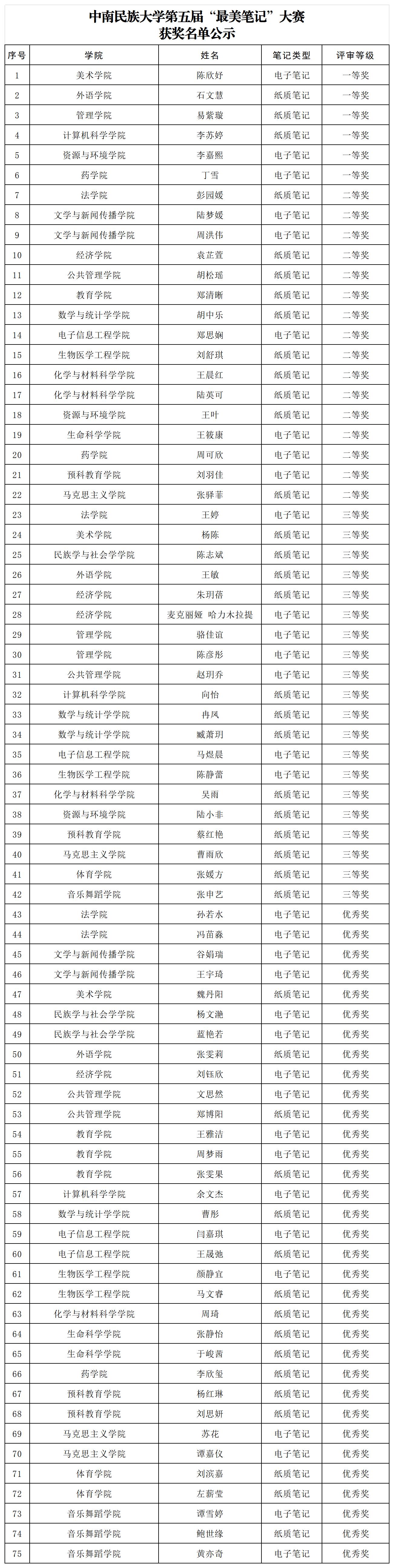 根據(jù)《關(guān)于舉辦中南民族大學第五屆“最美筆記”大賽的通知》,經(jīng)學生申報、學院推薦、學校評審等環(huán)節(jié),最終確定獲獎學生75人。其中一等獎6人、二等獎16人、三等獎20人、優(yōu)秀獎33人。具體名單見附件。學生對評選結(jié)果有異議的,可在公示期間向?qū)W校提出申訴。