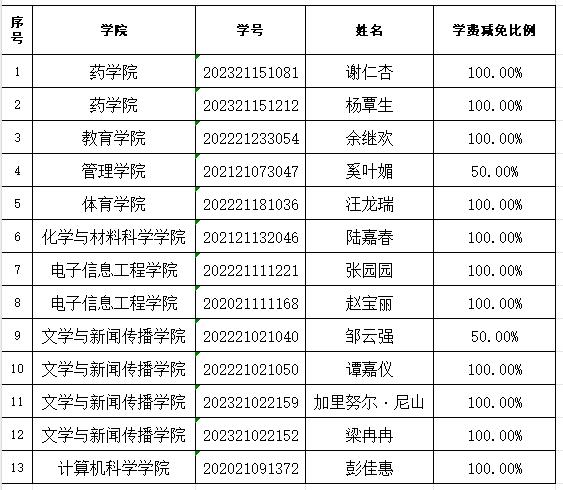 為進一步做好我校學生資助工作,幫助家庭經濟困難學生減輕生活壓力,激勵學生刻苦學習,幫助學生順利完成學業,根據《關于印發中南民族大學學生資助相關辦法(試行)的通知》(民大發【2014】61號)等文件精神,經學生個人申請、學院初審、學生資助管理中心審核后將2023—2024學年學費減免、無息借款意見報學校學生獎勵與資助工作領導小組審批通過,現將13名申請學費減免的學生及1名申請無息借款的學生名單公示如下: