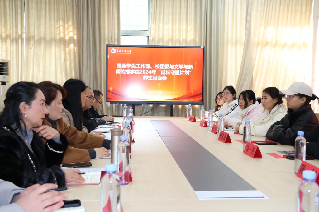 12月24日中午,黨委學生工作部、校團委聯合文學與新聞傳播學院,在大學生活動中心102會議室舉辦2024年“成長守望計劃”師生見面會。校黨委常委、副校長李紅燕,學工部、團委、文傳學院負責人,文傳學院24級新生輔導員以及相關師生參加活動,會議由文傳學院黨委書記謝嵐主持。