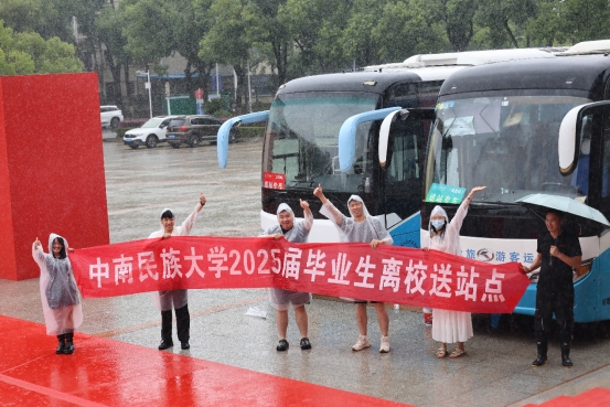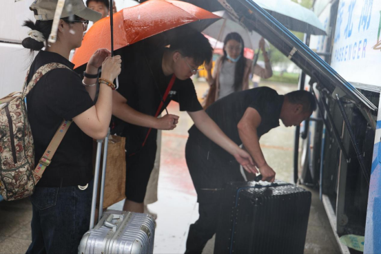 黨委學工部考慮天氣、交通堵塞以及畢業生行李沉重等因素,提前擬定送站工作方案,在體育館廣場集中設置乘車點,開通直達火車站的免費送站專線大巴,連續2天,從早上8時至下午6時,安排多趟車次往返送站。為做好暴雨、大雨天氣下的送站服務,黨委學工部在乘車點設置服務驛站,提供礦泉水、雨衣等物資,設置送站小程序,學生掃碼即可登記乘車。在送站現場,送站的老師和志愿者身披雨衣協助畢業生搬運行李,并送上溫馨的畢業祝福,同時做好車輛調度銜接,引導畢業生有序乘車。