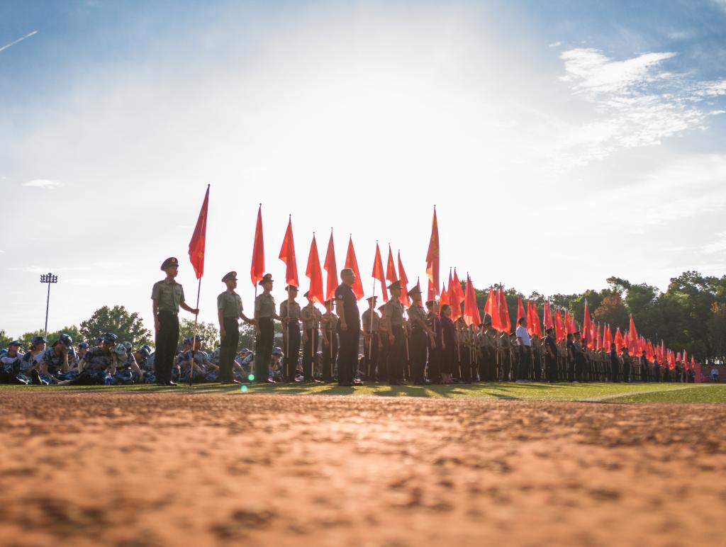 暖場環節中,全場齊聲高唱《團結就是力量》《我的祖國》《沒有共產黨就沒有新中國》,歌聲激昂,情感真摯。在莊嚴的升國旗、奏唱國歌儀式中,軍訓開訓儀式正式拉開了帷幕。