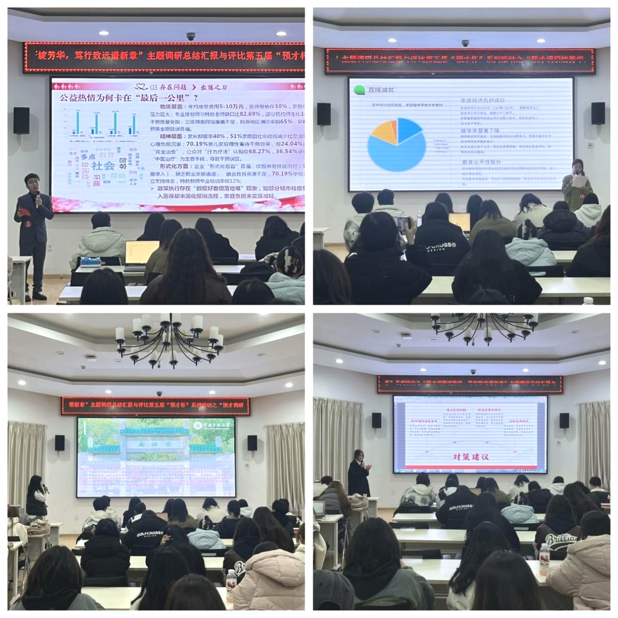 本次主題調研涉獵廣泛,涵蓋了鄉村振興、環境保護、關愛兒童、紅色文化、鑄牢中華民族共同體意識等多個話題,經班級初選,24位同學脫穎而出,其中預文2401班張迪聚焦孤獨癥兒童,倡導凝聚社會力量,助力孤獨癥群體走出困境;預文2404班巴文博以“鄉村振興,餐惠童心”為主題開展主題調研,提出營養餐“校農結合”的優化建議,助力鄉村振興發展;預理2407班程婧怡走進貴州省臺盤村,對“村BA”賦能鄉村振興提出相關實際建議;預理2402班張嘉怡以探訪紅色文化基地與校園宣講,感悟紅色文化傳承意義,提出加大紅色資源宣傳等建議……