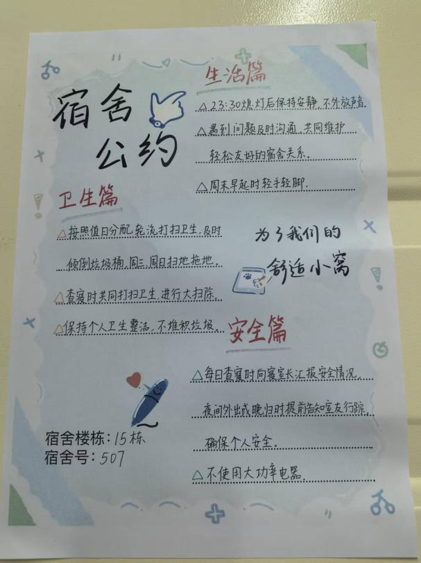 據悉,這批寢室公約已陸續張貼于各宿舍顯要位置,成為同學們自我管理、自我約束的“隱形老師”。薛光洋表示,公約制定不是簡單的規則羅列,而是同學們適應新宿舍生活、學會尊重包容的重要一課,學院將通過定期檢查與日常督導,推動公約從“紙面”落到“行動”,助力構建安全、文明、和諧的宿舍育人環境。