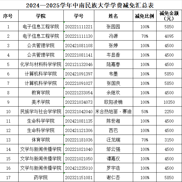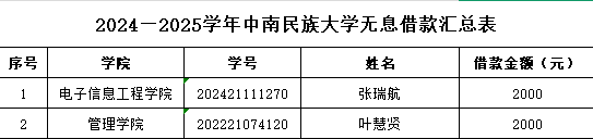 為進一步做好我校學生資助工作,幫助部分孤兒、重度殘疾學生、遭遇意外傷害或患嚴重疾病學生等家庭經(jīng)濟特別困難學生減輕生活壓力,激勵他們刻苦學習,順利完成學業(yè),根據(jù)《中南民族大學學費減免管理辦法(修訂)》(民大發(fā)[2024]91號)《中南民族大學校內無息借款管理辦法(修訂)》(民大發(fā)[2025]10號)等文件要求,經(jīng)學生個人申請、學院初審、學工部學生資助管理中心審核后將2024—2025學年學費減免、無息借款意見報學校學生獎勵與資助工作領導小組審批通過,現(xiàn)將17名申請學費減免的學生及2名申請無息借款的學生名單公示如下: