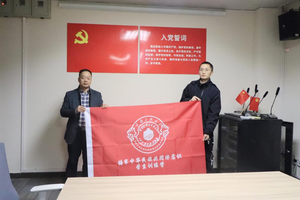會上,潘宏飛代表黨委學(xué)生工作部為鑄牢中華民族共同體意識學(xué)生訓(xùn)練營授旗。