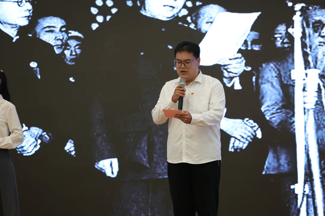 計算機科學學院2021級本科生黨支部用情景劇和PPT聯合的形式展現:一幕幕的歷史長卷在舞臺上鋪展開來,燈光在投影屏幕上閃爍,仿佛穿越時光隧道,見證新中國四個階段的青年風貌,并結合自身經歷分享,展示了同學們追求卓越,勇攀高峰的進取精神。