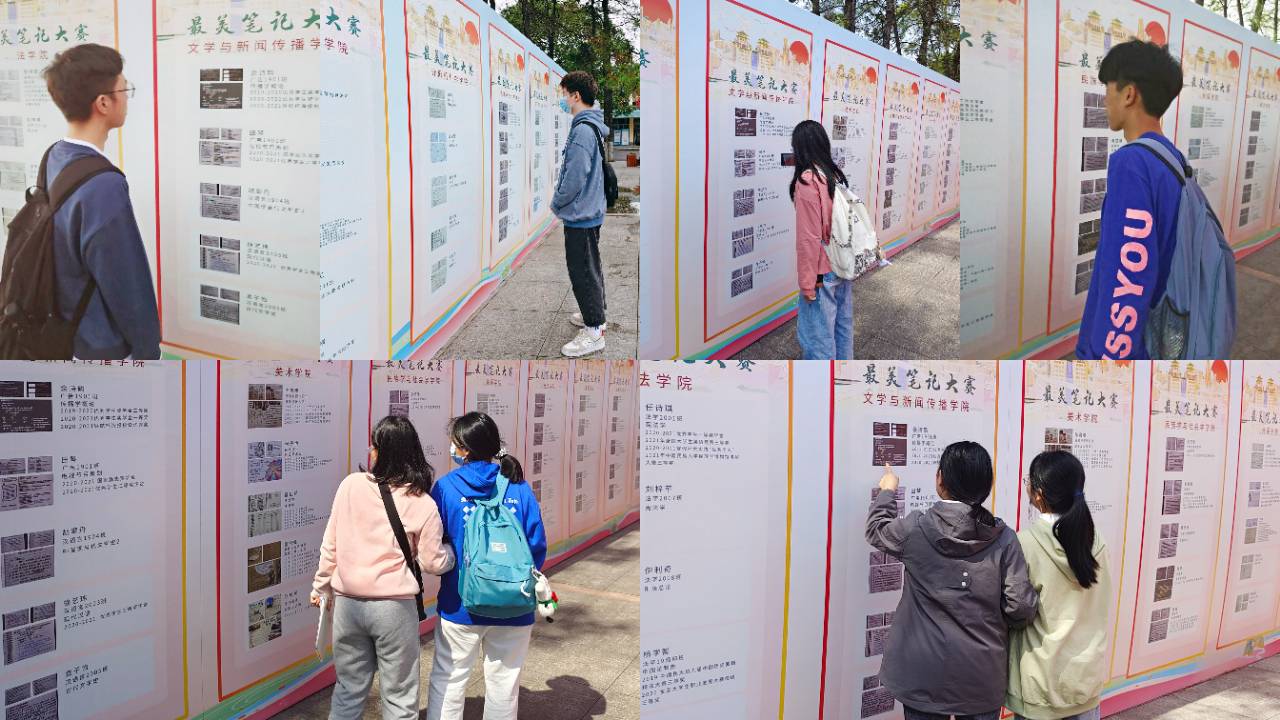 網絡投票階段,學校還將所參賽筆記在一、二食堂之間通過桁架展示所有參賽筆記。參賽選手筆記形式豐富、圖文并茂、字跡工整、排版優美、專業特色鮮明,展板開設當天,引起了學生們的駐足觀看和學習討論。