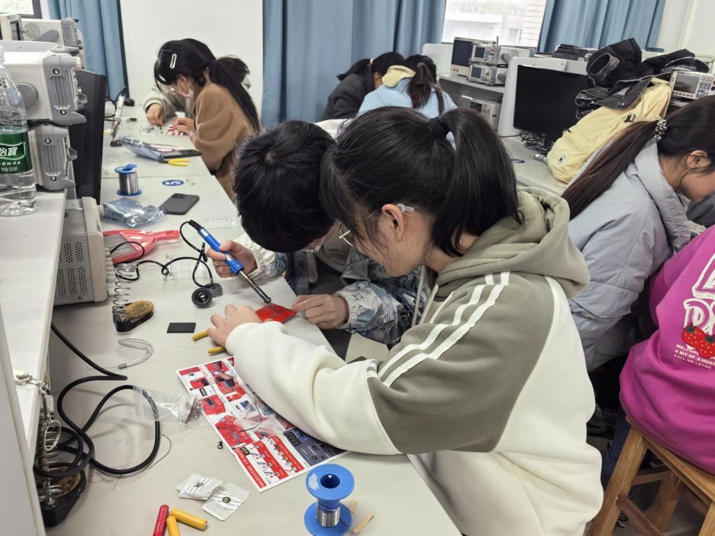 低年級組團隊成員間默契配合,在羅媛媛老師的專業指導下,同學們專注于電路板的搭建與調試。比賽現場,同學們沉著應戰,充分展現出團結協作的精神。