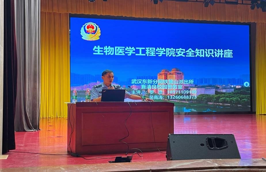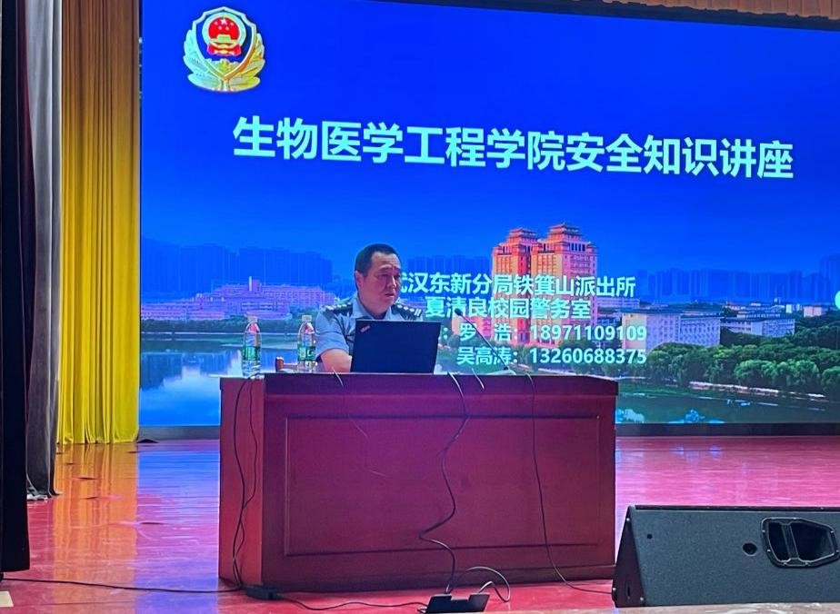 (文/吳明洋,圖/吳明洋)2025年5月26日晚,生物醫學工程學院在學術會堂開展安全知識講座。講座特邀武漢東湖分局鐵箕山派出所羅浩警官和吳高濤警官主講,輔導員柴成龍主持,2022級、2023級本科生和2023級研究生參加本次講座。