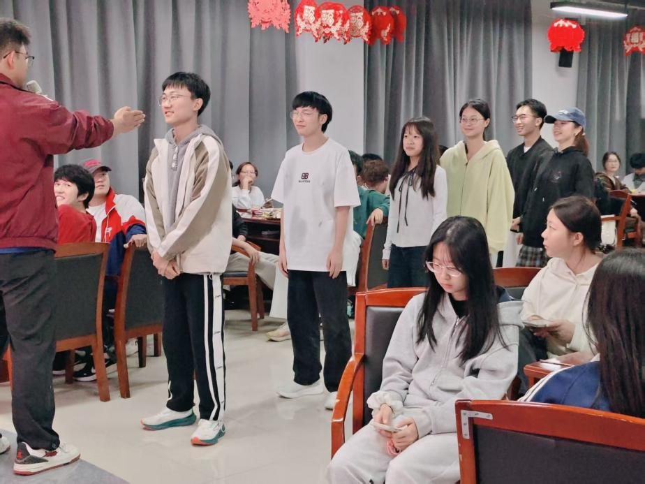 接下來,互動游戲與才藝表演輪番登場,同學們全情投入、各展所長,現場氛圍在歡聲笑語中持續升溫。“三詞成句”“正話反說”“加字游戲”“動作反做”等互動游戲接連進行,同學們積極參與、默契配合,熱鬧的氛圍讓同學們的距離快速拉近。才藝表演同樣精彩紛呈,冉皓銘同學演唱的《平凡的一天》溫暖治愈,楊帆同學和鄭曦同學合唱的《晴天》滿是青春氣息,現場氛圍輕松愉悅。