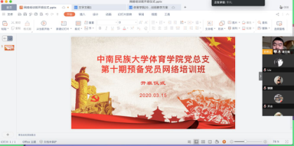根據“學生不離家、不返校,老師不停教、學生不停學,教學質量標準不降低、學生畢業不延期”相關要求,結合中共中南民族大學委員會黨校《關于舉辦2020年度預備黨員網絡培訓班(總第10期)的通知》(民大黨校〔2020〕1號)的文件精神。2020年3月15日,體育學院黨總支舉行了第十期預備黨員網絡培訓班開班儀式,開班儀式由本次培訓班班班主任唐文翰主持,學院黨總支副書記鄭重、組織員韋甜及全體預備黨員參加會議。