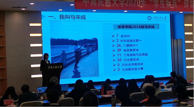 2020年12月4日在國際會議交流中心舉辦了中南民族大學2020年“學生標兵”評審答辯會,體育學院2018級學生馬宋成榮獲才能突出獎。