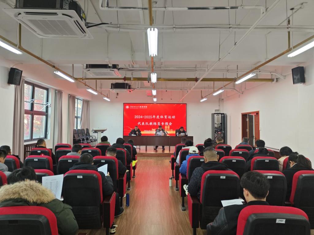 12月24日上午體育學(xué)院在體育訓(xùn)練中心304召開2024-2025年度體育運(yùn)動(dòng)代表隊(duì)教練員專題會(huì),體育學(xué)院領(lǐng)導(dǎo)班子成員、運(yùn)動(dòng)隊(duì)工作領(lǐng)導(dǎo)小組全體成員及各運(yùn)動(dòng)隊(duì)教練參會(huì),會(huì)議由張懷成主持。