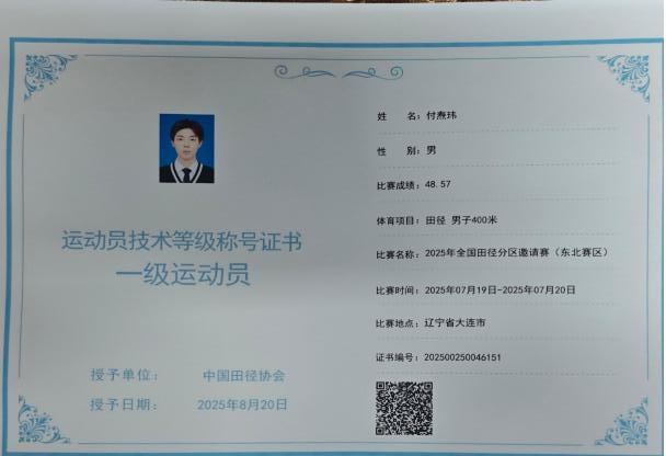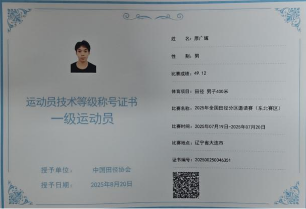 近日,我院社會體育指導與管理專業2024級付燾瑋、2023級原廣輝收到中國田徑協會頒發的運動員技術等級稱號證書,雙雙獲得田徑男子400米一級運動員。此次成績的取得,標志著我院在人才培養上實現新的突破,這也是我院建院以來自主培養的首批田徑項目國家一級運動員。