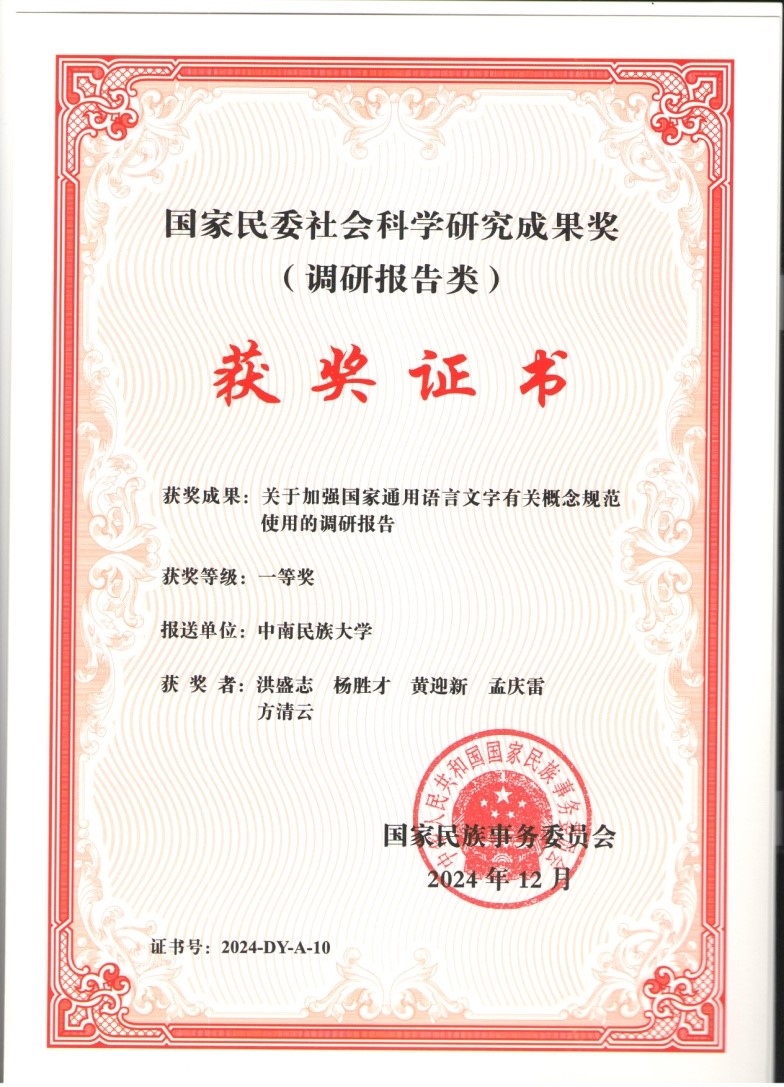 近日,國家民族事務委員會公布了國家民委社會科學研究成果獎(調研報告類),我院洪盛志副教授牽頭撰寫的《關于加強國家通用語言文字有關概念規范使用的調研報告》榮獲一等獎。