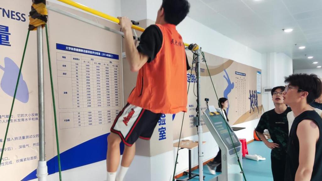 在17號教學樓智能體側實驗室,志愿者為參與仰臥起坐、引體向上、立定跳遠、有氧肺活量等項目測試的學生提供指導,糾正動作,講解測試要點。