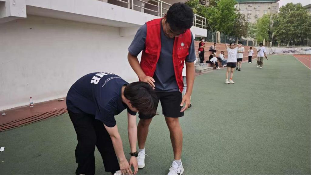 在南湖操場,針對50米跑、800米跑(女生)、1000米跑(男生)項目,志愿者帶領學生進行熱身,跑步時為學生加油鼓勵,結束后指導學生進行拉伸。