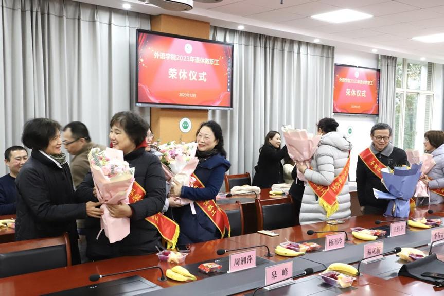 12月14日,外語學(xué)院為2023年度退休的教職工王紅衛(wèi)、魏興無、楊俐玲、劉蔚三、周湘萍等老師舉行了隆重的榮休儀式。黨委書記李春雷、院長(zhǎng)易立新、正處級(jí)專職組織員韋應(yīng)忠、副院長(zhǎng)皋峰、副院長(zhǎng)李明和各教研室教師代表參加了儀式。