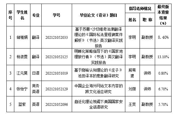 根據學校《關于做好2025屆本科生校級優秀畢業論文(設計)評選工作的通知》《中南民族大學本科學生畢業論文(設計)管理辦法》相關規定和《外語學院本科生校級優秀畢業論文(設計)評選實施辦法》,我院按照公平、公正、公開的原則,對各專業推薦的優秀論文“知網”查重檢測結果進行審核,組織答辯和專家匿名外審,最終評選出5篇校級優秀畢業論文,現將2025屆本科生校級優秀畢業論文擬推薦名單公示如下: