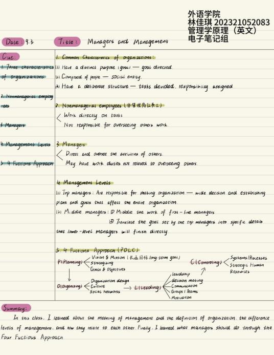 本次大賽由商務英語系主任陳珞瑜、英語系副主任萬麗華、語言學教研室劉昕老師三位專業(yè)教師及2024級輔導員藍志標組成評審組,從“主題明確、邏輯清晰、重點突出、版式規(guī)范”等維度對20份參賽作品進行了認真評審。經評審組遴選,林佳琪同學的《管理學原理(英文)》課程筆記憑借“康奈爾筆記法”的結構優(yōu)勢和深度拓展,榮獲一等獎。謝菲、嚴冬婷獲二等獎;黃藝龍等4人獲三等獎,蘇星宇等5人獲優(yōu)秀獎。