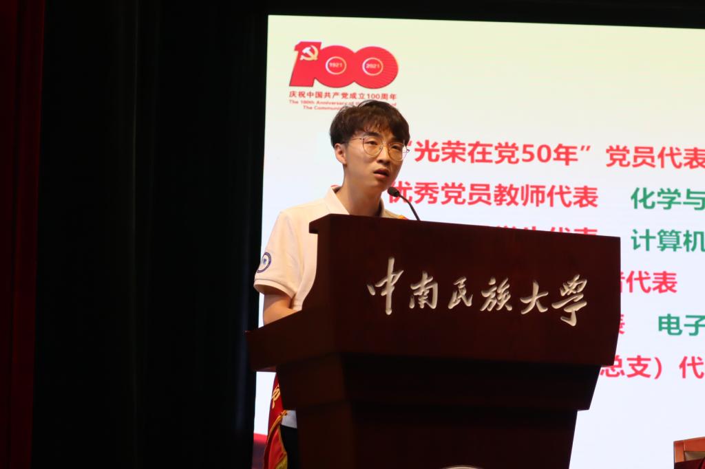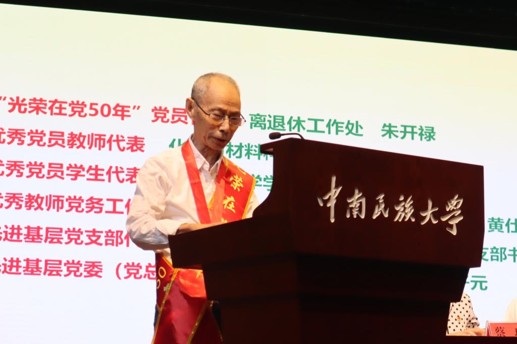 榮獲“光榮在黨50年”紀(jì)念章黨員代表、離退休工作處黨委離休黨支部書記、87歲老同志朱開祿,飽含深情地回顧了老黨員群體的入黨初心和在黨經(jīng)歷,抒發(fā)了對(duì)黨永遠(yuǎn)忠誠(chéng)的堅(jiān)定信仰、為人民服務(wù)的使命擔(dān)當(dāng)。優(yōu)秀共產(chǎn)黨員教工代表、化材學(xué)院李琳,優(yōu)秀共產(chǎn)黨員學(xué)生代表、計(jì)科學(xué)院劉浩,優(yōu)秀黨務(wù)工作者代表、采購(gòu)與招投標(biāo)中心黨支部書記黃仕清,先進(jìn)基層黨支部代表、電信學(xué)院教工創(chuàng)新團(tuán)隊(duì)黨支部副書記崔勇強(qiáng),先進(jìn)基層黨委(黨總支)代表、美術(shù)學(xué)院黨委書記劉子元等同志分別發(fā)言,匯報(bào)了在黨的光輝指引下各自的工作、學(xué)習(xí)經(jīng)歷和體會(huì),及黨建工作的先進(jìn)經(jīng)驗(yàn)和做法,表達(dá)了為學(xué)校事業(yè)發(fā)展、為中華民族偉大復(fù)興努力奮斗的信心和決心。