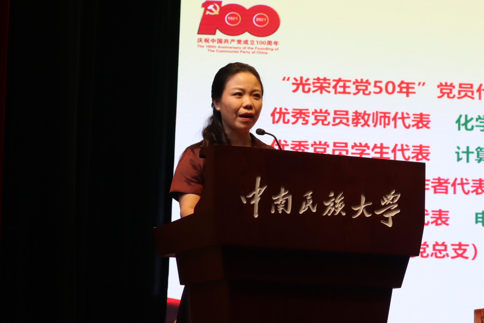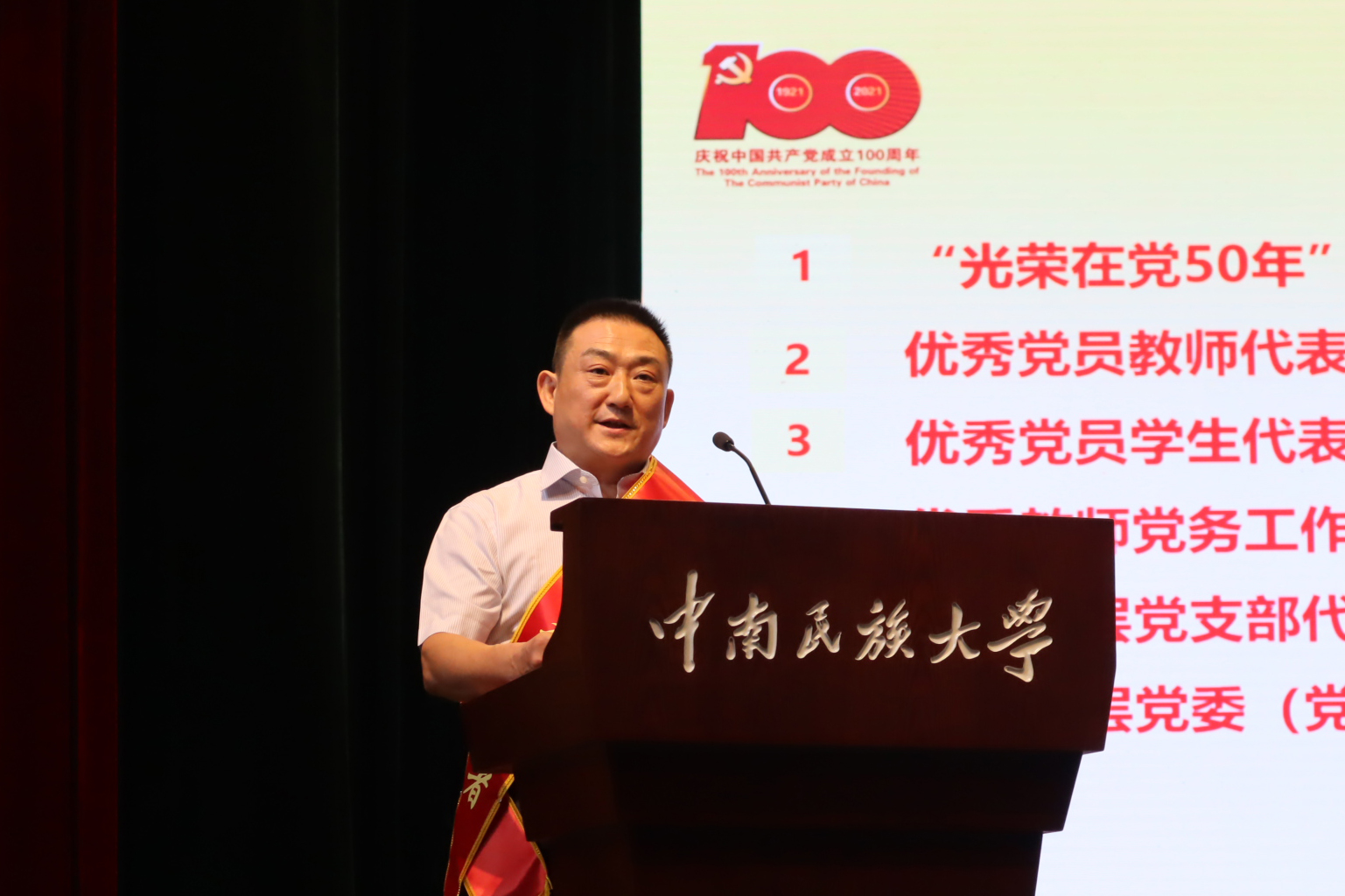 與會(huì)同志共同觀看了微視頻《中國(guó)共產(chǎn)黨百年述職報(bào)告》《你,為什么入黨?》。在莊嚴(yán)的國(guó)歌聲中,大會(huì)正式開幕。校黨委副書記白江源宣讀了《中南民族大學(xué)榮獲“光榮在黨50年”紀(jì)念章黨員名單》,校黨委副書記、副校長(zhǎng)宋發(fā)軍宣讀了“兩優(yōu)一先”表彰決定。校黨委常委為老黨員頒發(fā)“光榮在黨50年”紀(jì)念章,為受表彰的優(yōu)秀共產(chǎn)黨員、優(yōu)秀黨務(wù)工作者和先進(jìn)基層黨組織頒獎(jiǎng)。