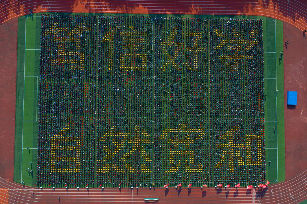 新生在體育場上排列出校訓“篤信好學,自然寬和”字樣。李翰馳 攝