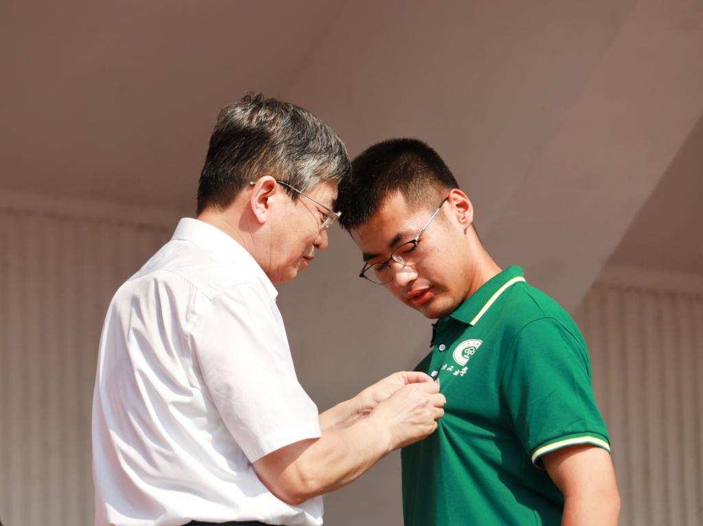 校黨委書記邊境為賀吉潤佩戴校徽。陳張馳 攝
