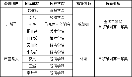 近日,第十二屆社科獎全國高校市場營銷大賽全國總決賽結(jié)果揭曉。我校江城子團(tuán)隊榮獲全國總決賽二等獎、單項策劃賽一等獎,指導(dǎo)老師徐姍姍榮獲營銷教學(xué)名師獎,團(tuán)隊成員韓馨穎同學(xué)榮獲最佳領(lǐng)導(dǎo)力獎、孟孔同學(xué)榮獲優(yōu)秀精英獎。此外,市營路人團(tuán)隊榮獲單項策劃賽一等獎,學(xué)校榮獲優(yōu)秀組織獎。