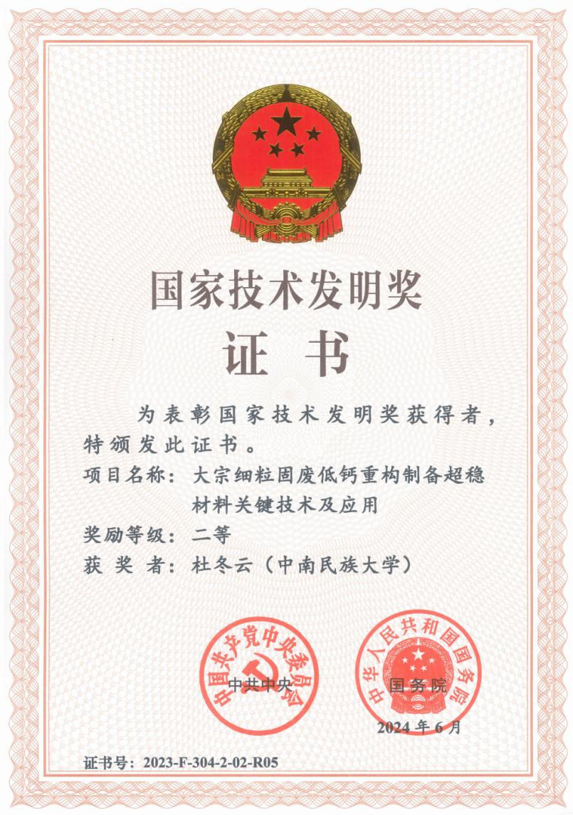 此次獲獎項(xiàng)目為“大宗細(xì)粒固廢低鈣重構(gòu)制備超穩(wěn)材料關(guān)鍵技術(shù)及應(yīng)用”,是由武漢大學(xué)與我校等4家單位共同完成。武漢大學(xué)資源與環(huán)境科學(xué)學(xué)院侯浩波教授為第一完成人,我校化學(xué)與材料科學(xué)學(xué)院杜冬云教授為第五完成人。
