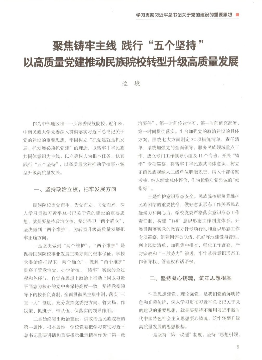 文章強調,民族院校因黨而生、為黨而立、向黨而興,深入學習貫徹習近平總書記關于黨的建設的重要思想,就是要堅持政治立校,堅定捍衛“兩個確立”,堅決做到“兩個維護”,始終突出政治建設,維護意識形態安全,為轉型升級高質量發展把牢正確方向;就是要堅持不懈用習近平新時代中國特色社會主義思想凝心鑄魂,堅持“第一議題”制度,鞏固拓展主題教育成果,推進“大思政課”建設,筑牢轉型升級高質量發展的思想根基;就是要抓干部、聚人才、強組織,干部“選育管用”全鏈條發力,人才“引育用留”全過程加強,組織“兩個功能”全方位增強,為轉型升級高質量發展提供堅強組織保證;就是要堅持服務中心,推進黨建與鑄牢中華民族共同體意識主線、立德樹人根本任務深度融合,構建“黨建+鑄牢”融合新模式,探索“黨建+育人”融合新路徑,拓展“黨建+業務”融合新成效,實現轉型升級高質量發展目標;就是要增強管黨治黨意識,落實管黨治黨責任,“兩個責任”一體履行,“黨紀教育”一體推進,“四責協同”一體落實,一刻不停推進全面從嚴治黨,為轉型升級高質量發展營造良好發展環境。