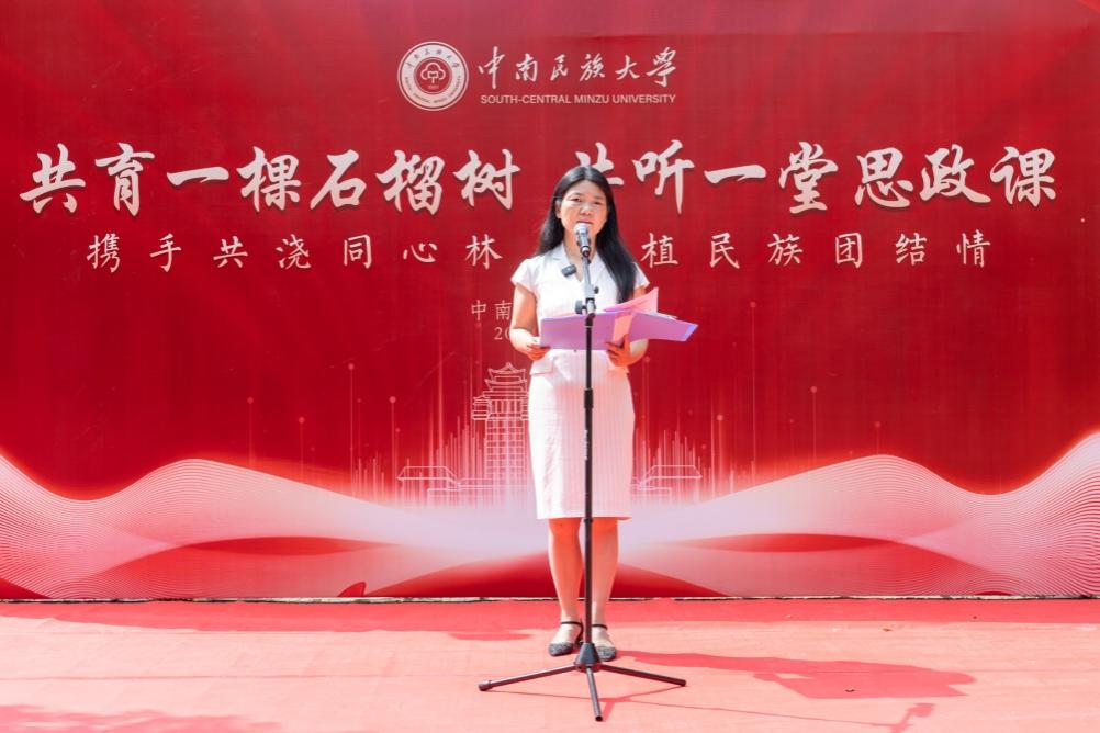 9月8日下午,“共育一棵石榴樹 共聽一堂思政課”活動在學校石榴園舉行。校黨委常委、副校長李紅燕,黨委學生工作部、黨委宣傳部相關負責人,各學院新生輔導員,與來自五湖四海的180余名新生同上“鑄牢”教育第一課。活動由黨委學生工作部部長楊濤主持。