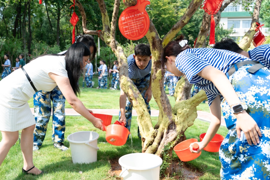 隨后,李紅燕代表全校教職員工,將來自祖國各地、象征著全體師生鑄牢中華民族共同體意識的團結之水,澆灌在石榴樹下,同學們也依次將自己帶來的家鄉水澆灌了一棵棵石榴樹。