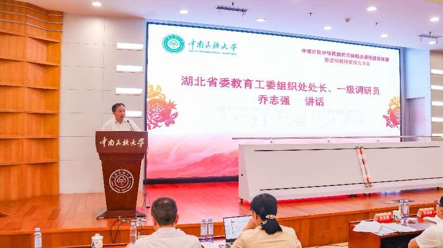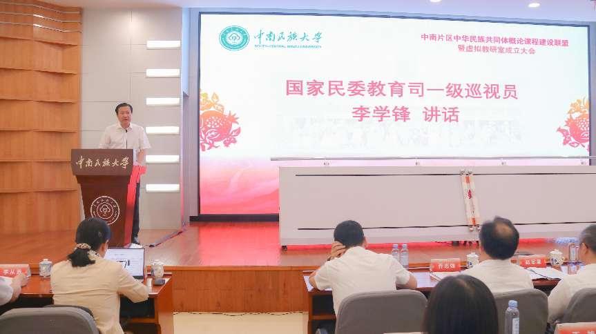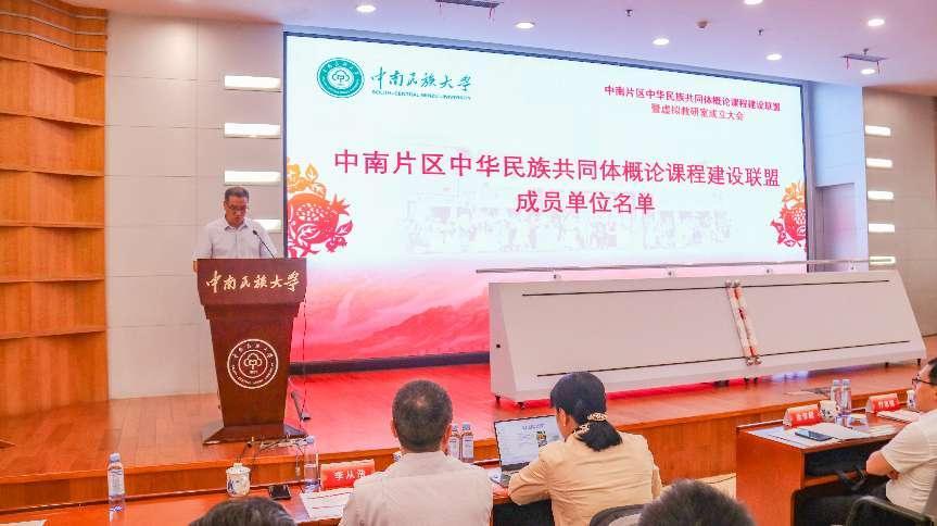宋發軍宣讀中南片區中華民族共同體概論課程建設聯盟成員名單、專家指導委員會名單及概論課虛擬教研室主任、副主任名單。隨后,課程建設聯盟暨虛擬教研室啟動。