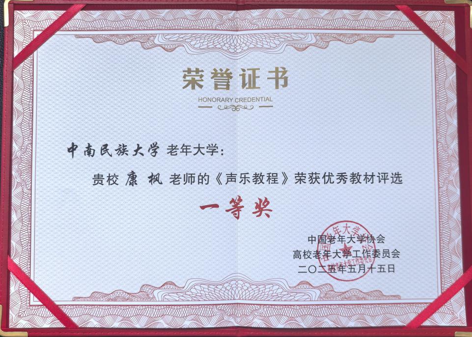 在5月16日召開的中國老年大學協會高工委三屆二次會議上,我校老年大學再傳捷報。由聲樂教師康楓編著的《聲樂教程》(桑榆未晚唱流年——從零開始的聲樂之旅)從全國高校選送的眾多作品中脫穎而出,榮獲優秀教材評選一等獎。這是繼2024年《中國民間舞蹈》榮獲精品課程一等獎之后,我校老年大學在全國老年教育領域斬獲的又一殊榮。