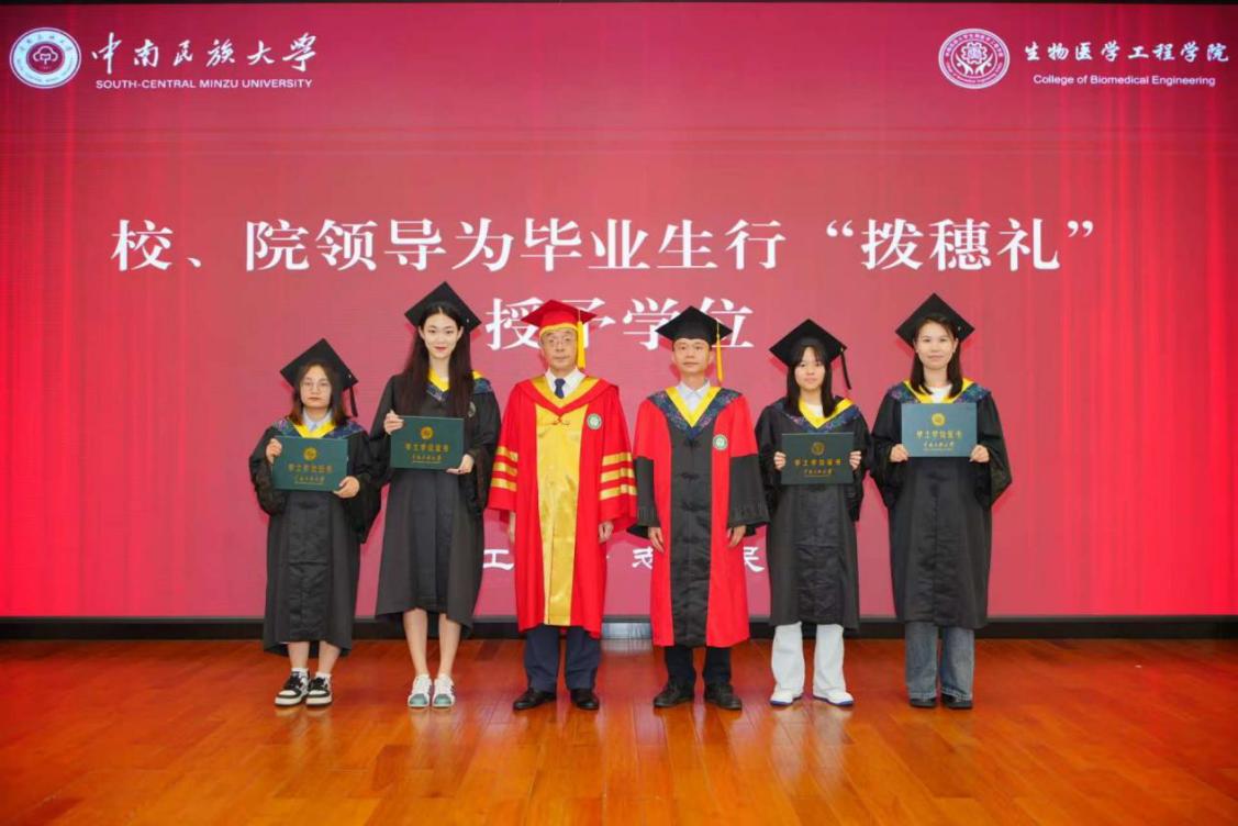 校黨委副書記、校長劉義為生物醫(yī)學工程學院畢生生行“撥穗禮”、授學位后合影。生醫(yī)學院供圖